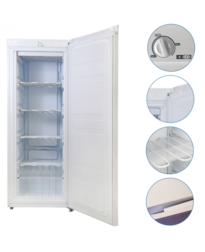 Ce congélateur compact vertical de 5,3 pied cube est idéal pour les sous-sol, des buanderies, ou des appartements. Il comporte des tablettes grillagées fixes facilitant l’accès aux petits objets et une porte s'installant tout aussi bien à gauche ou à droite, selon votre espace. La fiabilité du système de refroidissement du compresseur, sans CFC, maintient l’intérieur entre 0°C et -24°C (32°F et - 11,2°F) et le joint magnétique de la porte conserve le froid à l'intérieur, là où il devrait être.